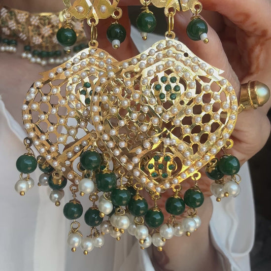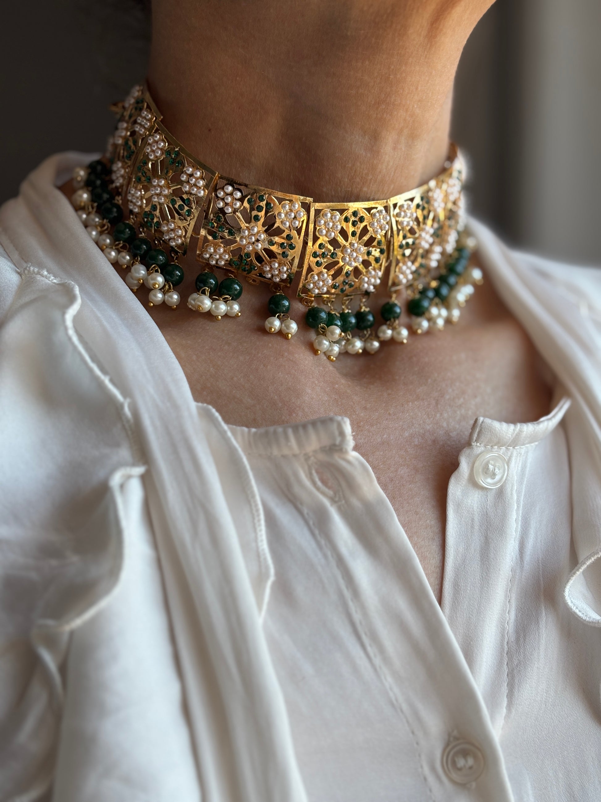 Gold plated jadau choker with green stone beads & pearls.