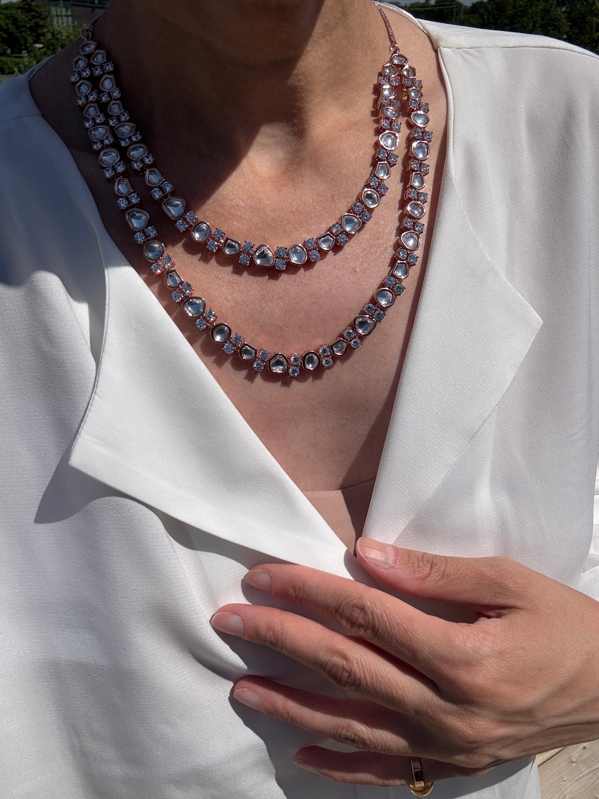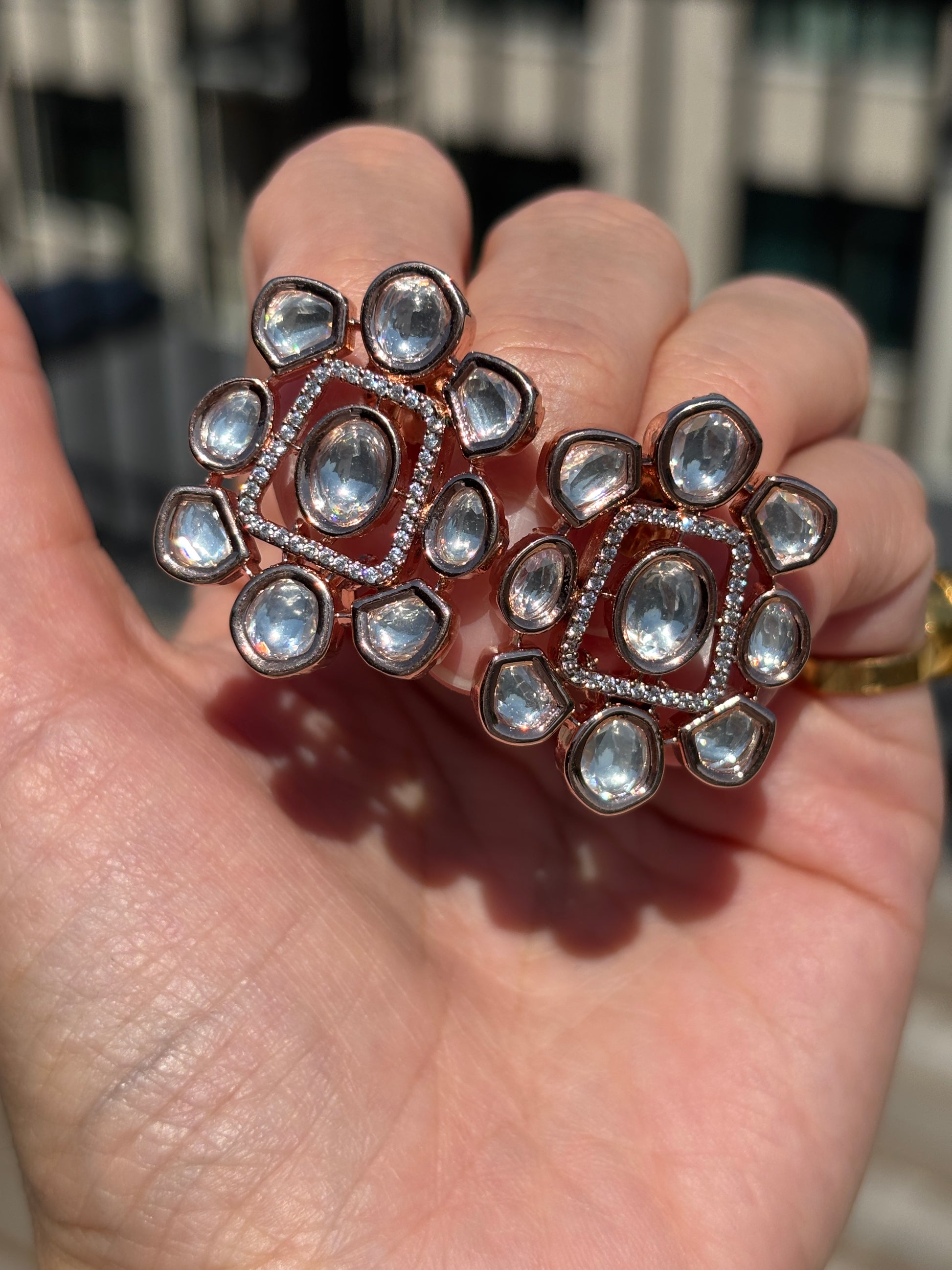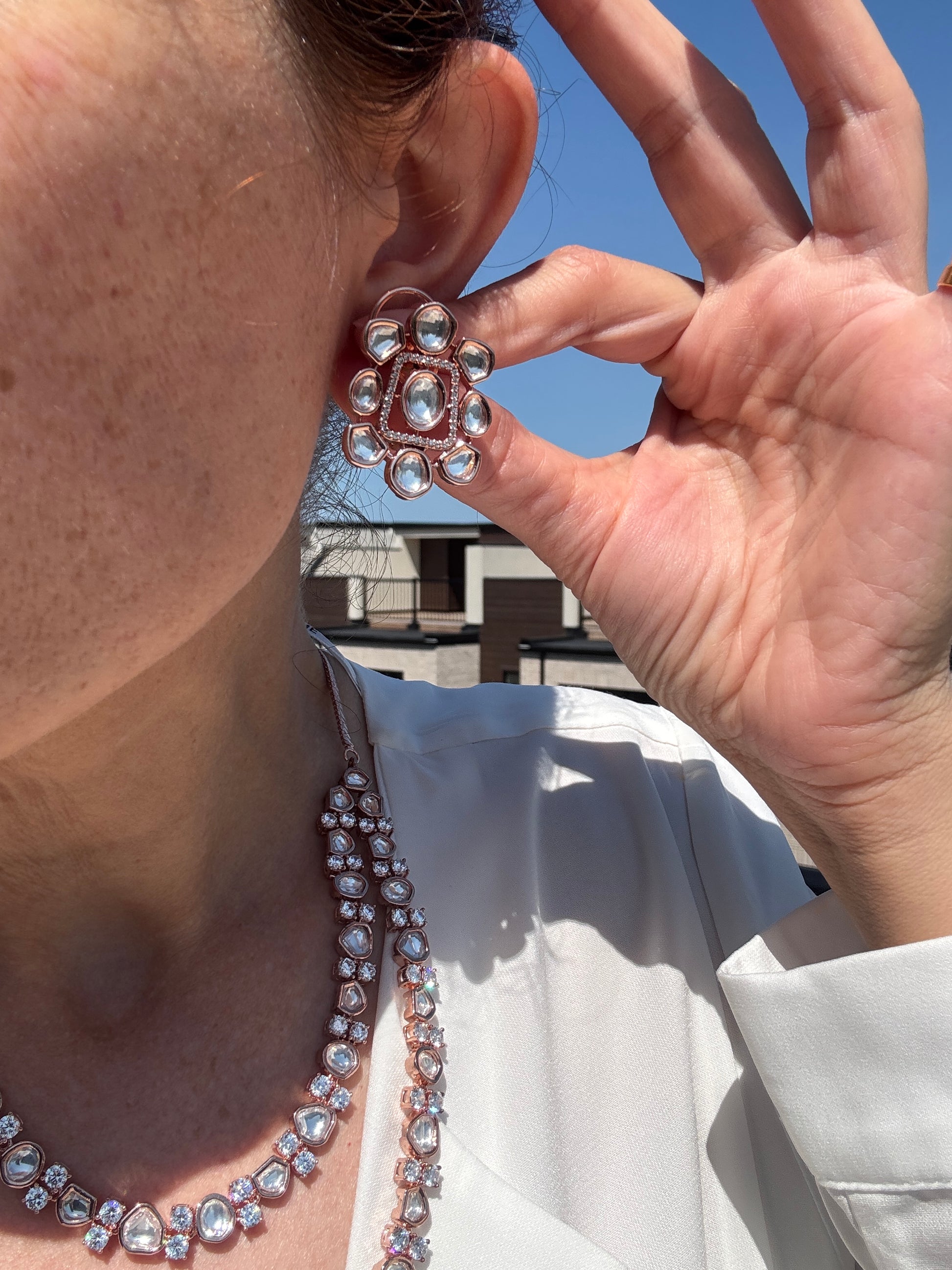 Tradition feels modern in this glamorous chic moissanite polki set with AD stones set in Rose Gold plating.