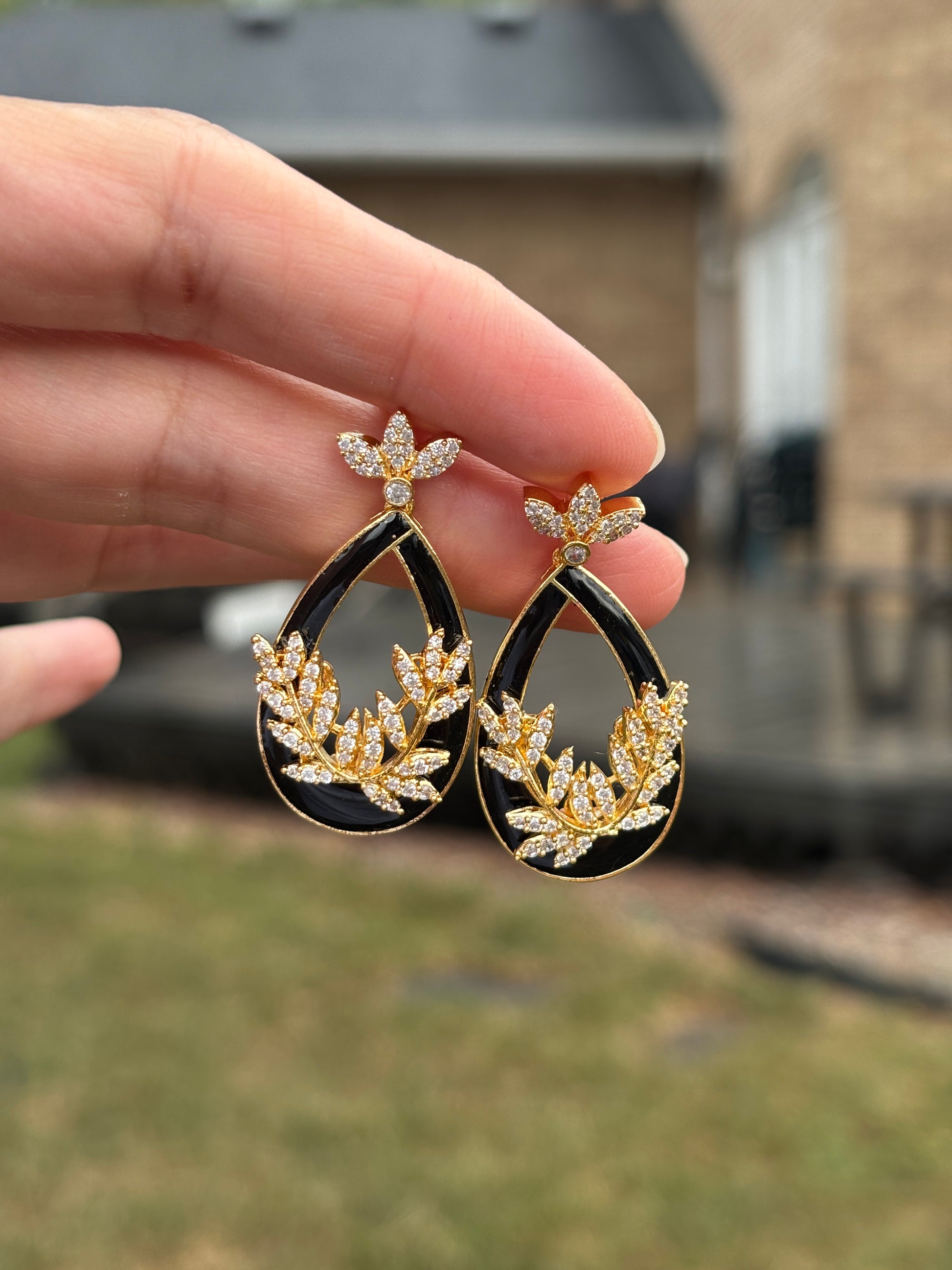 Beautiful black meenakari earrings with AD stones in detailed leaf patterns.