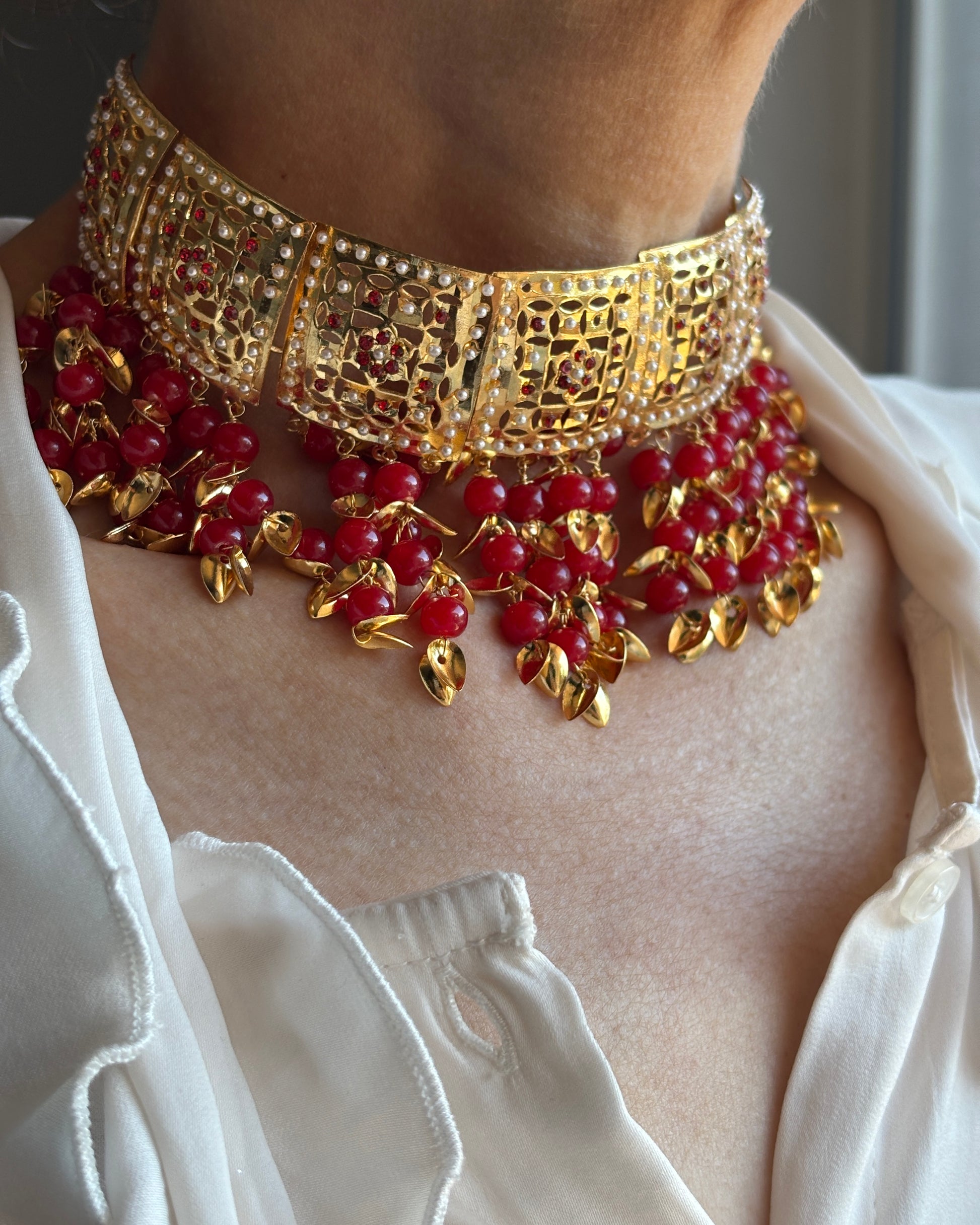 Jadau Gold Pipal Patti set with pearls, beads & AD stone, fully gold plated with earrings and tikka.