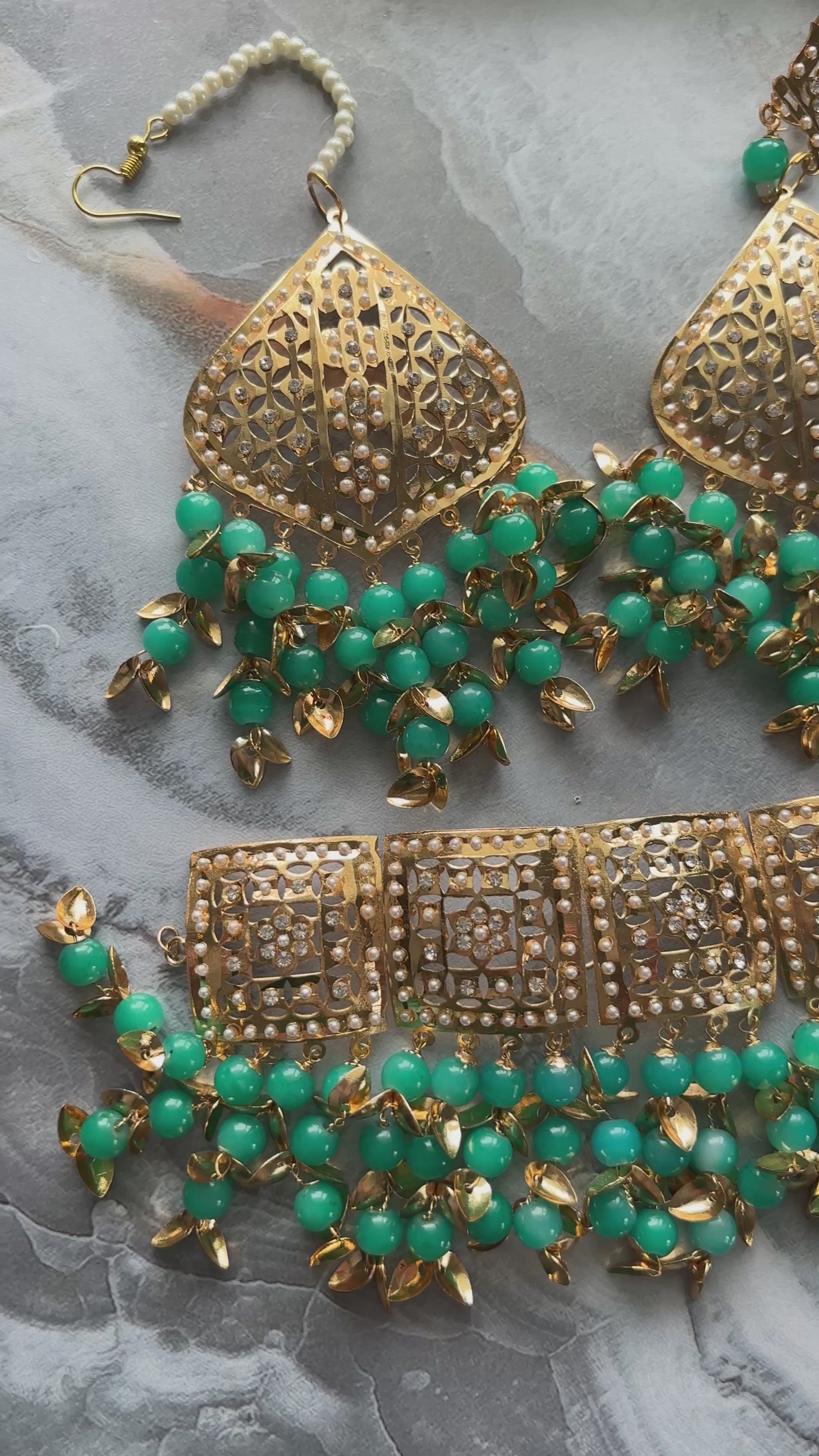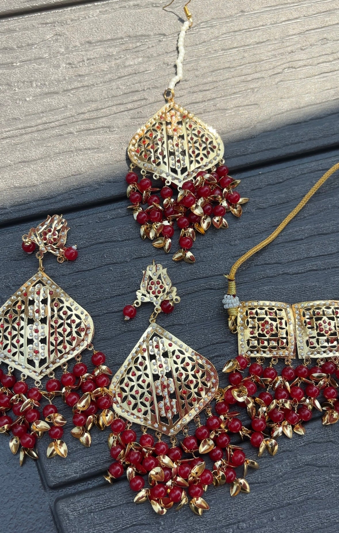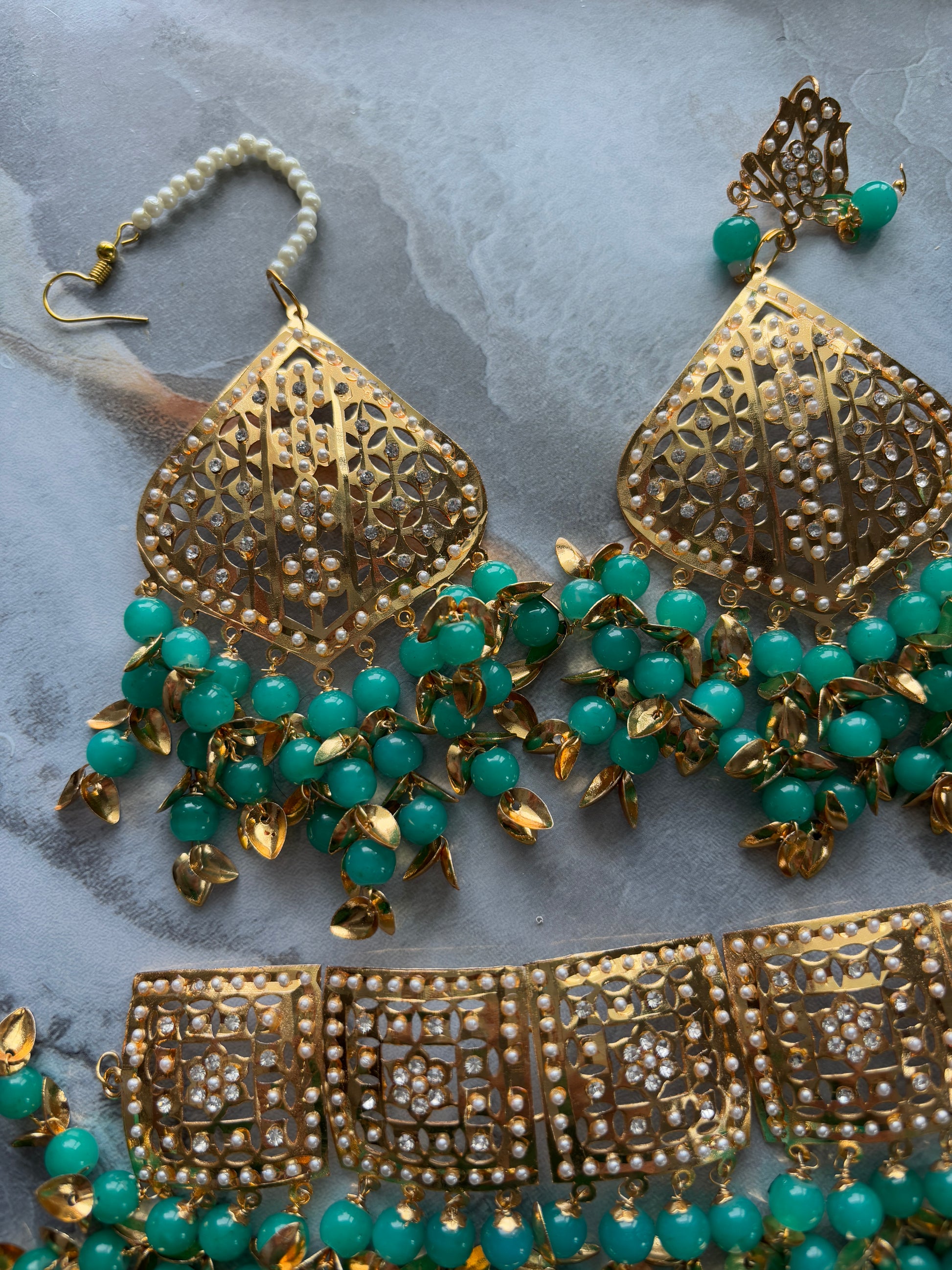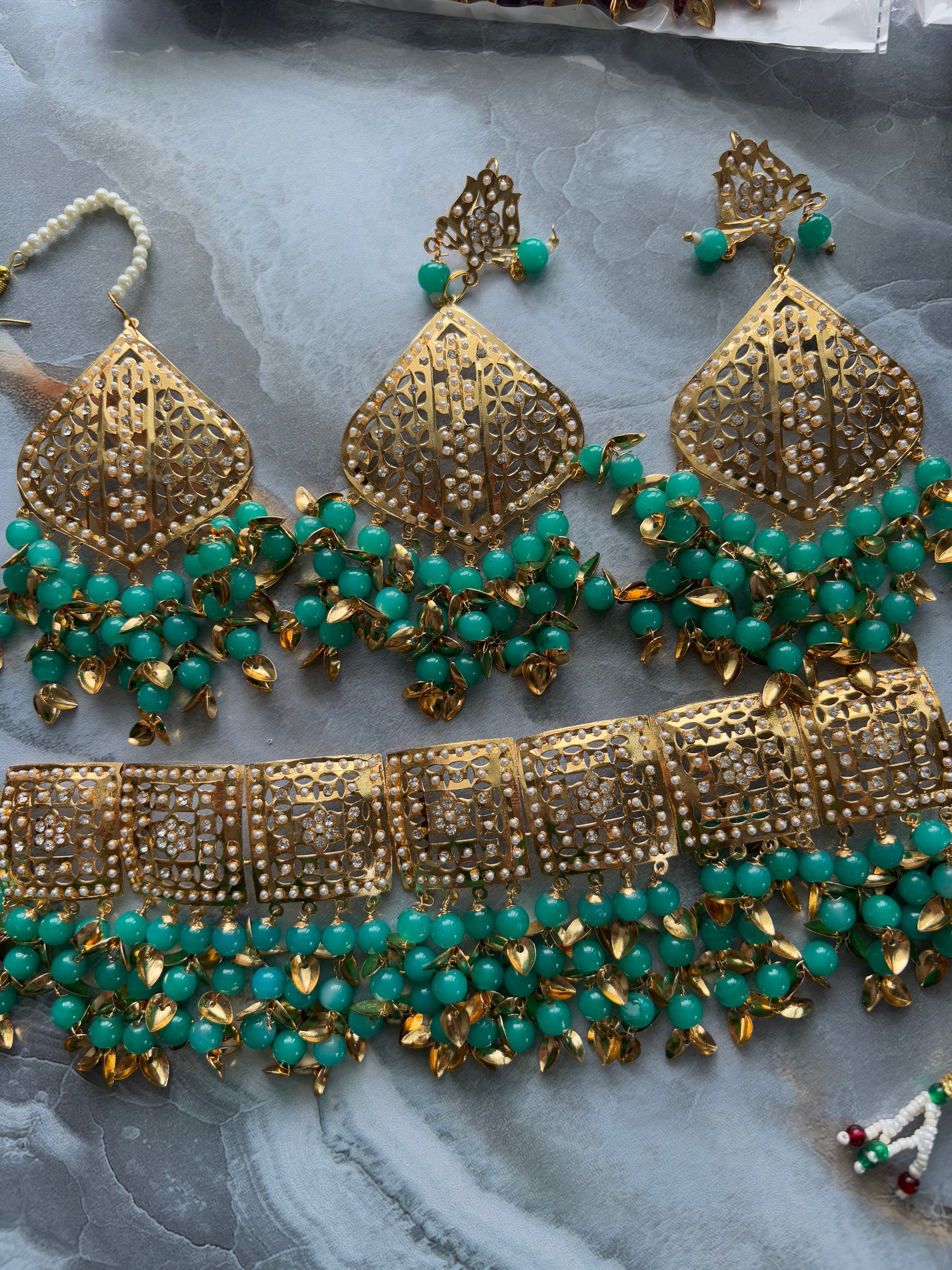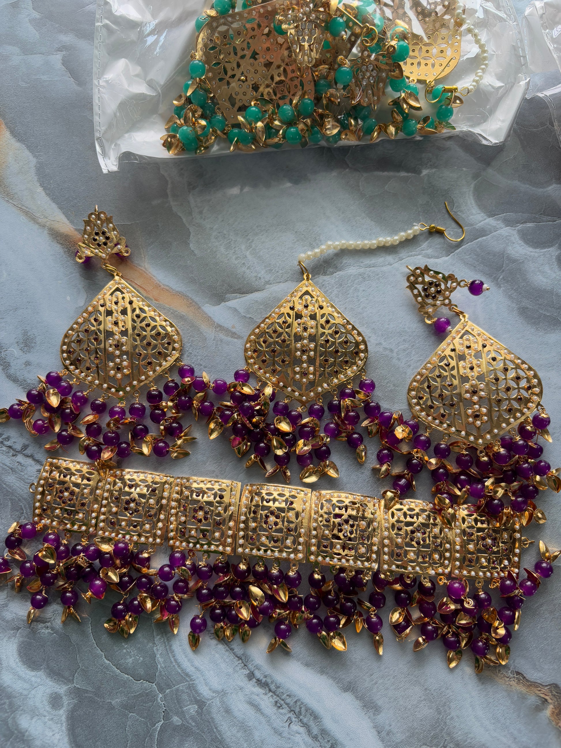 Jadau Gold Pipal Patti set with earrings and tikka.