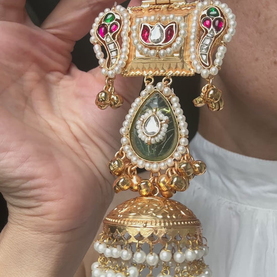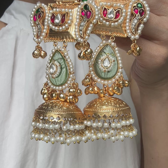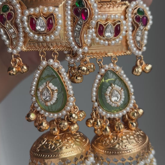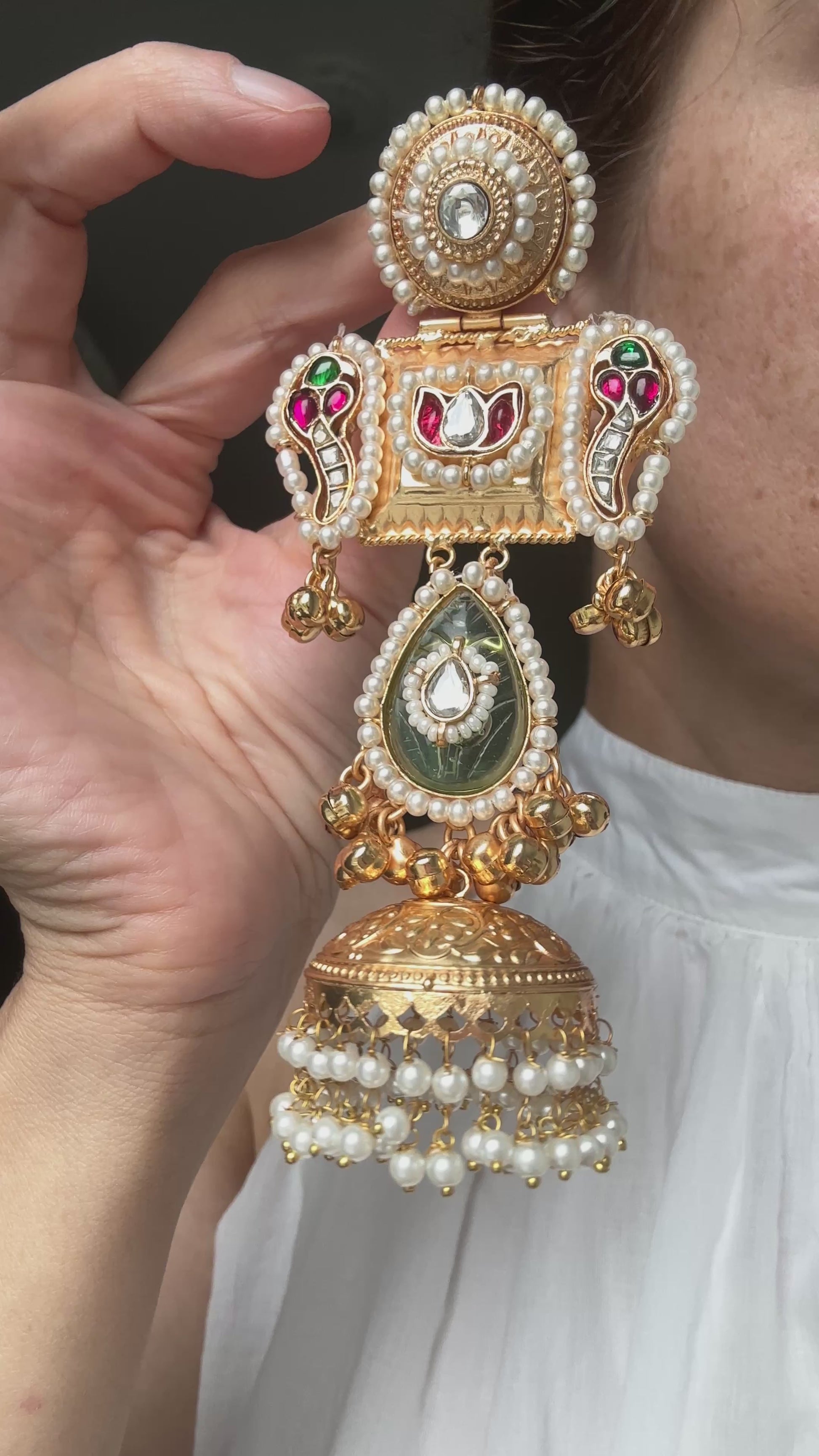 Pachi Kundan Kashmiri Earrings with cutwork stones, pearls & ghungroo.