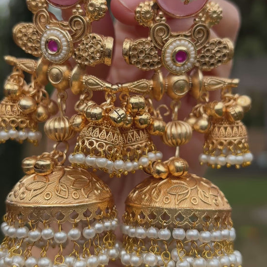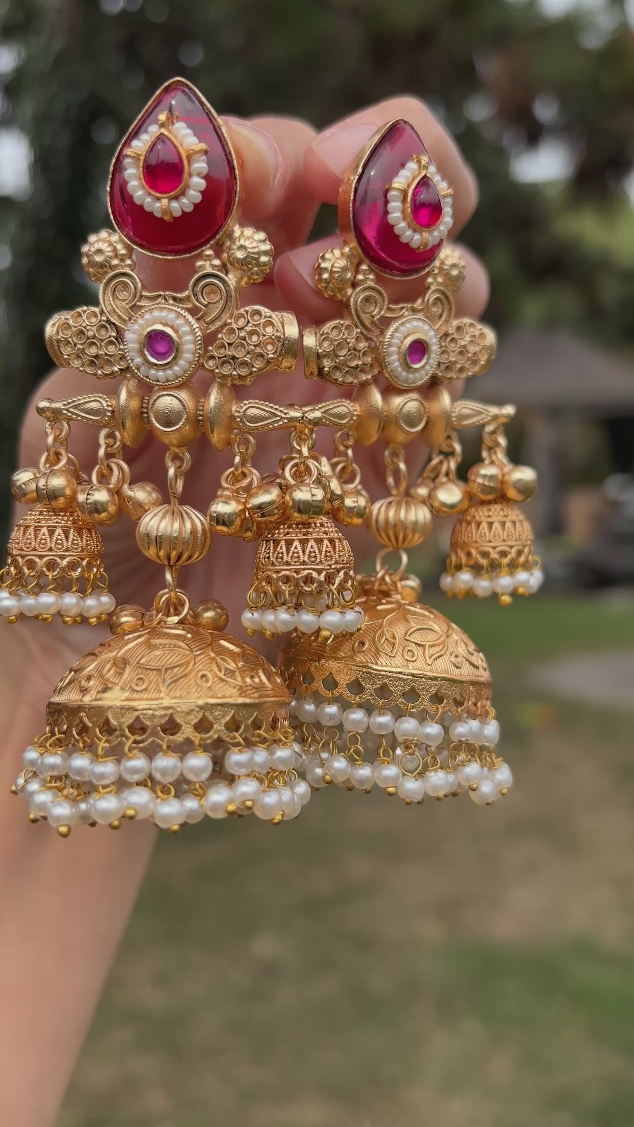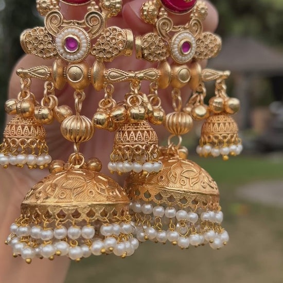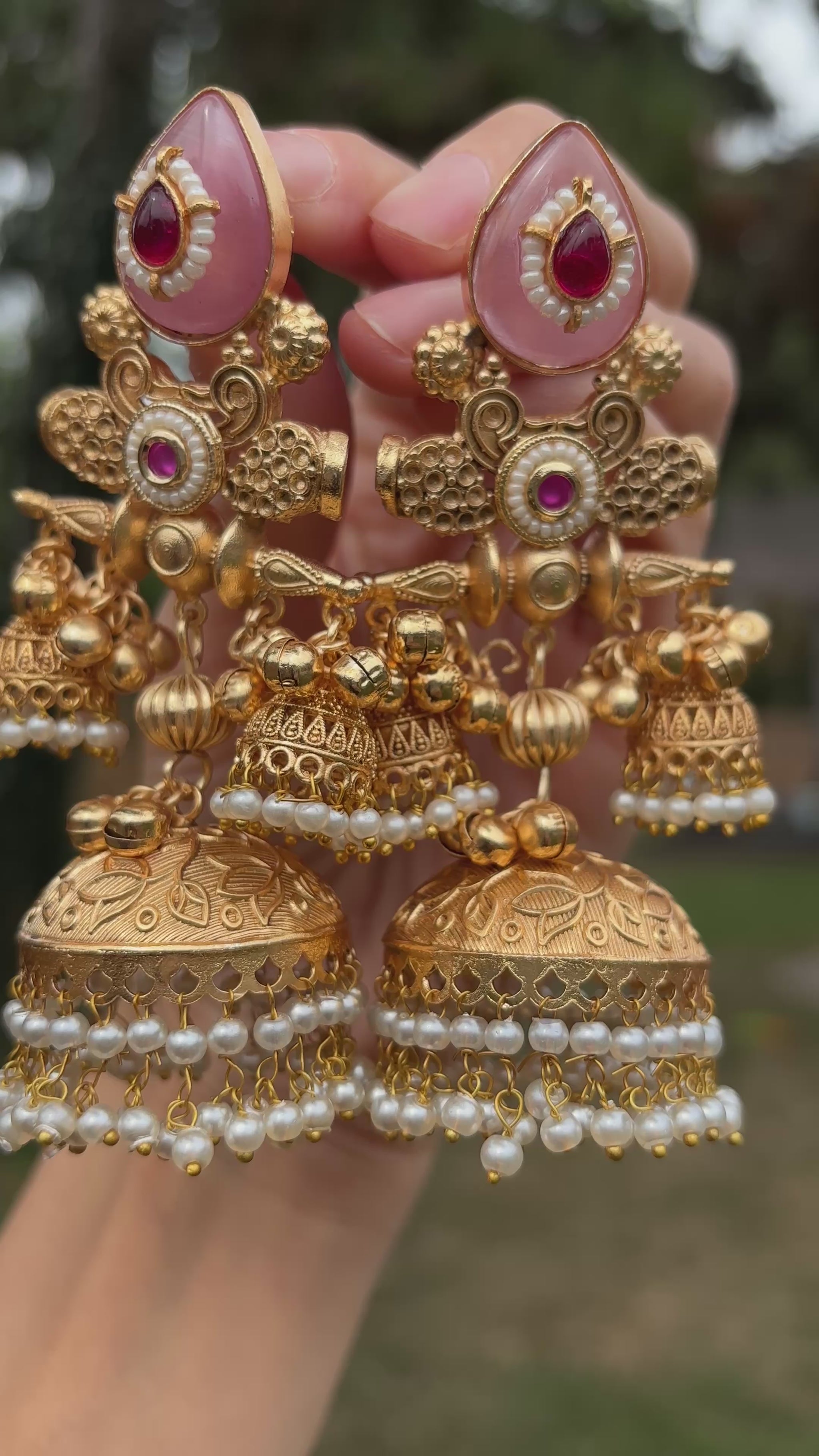 Graceful Kashmiri Jhumki Earrings with Kundan, Pearls & carved stones.
